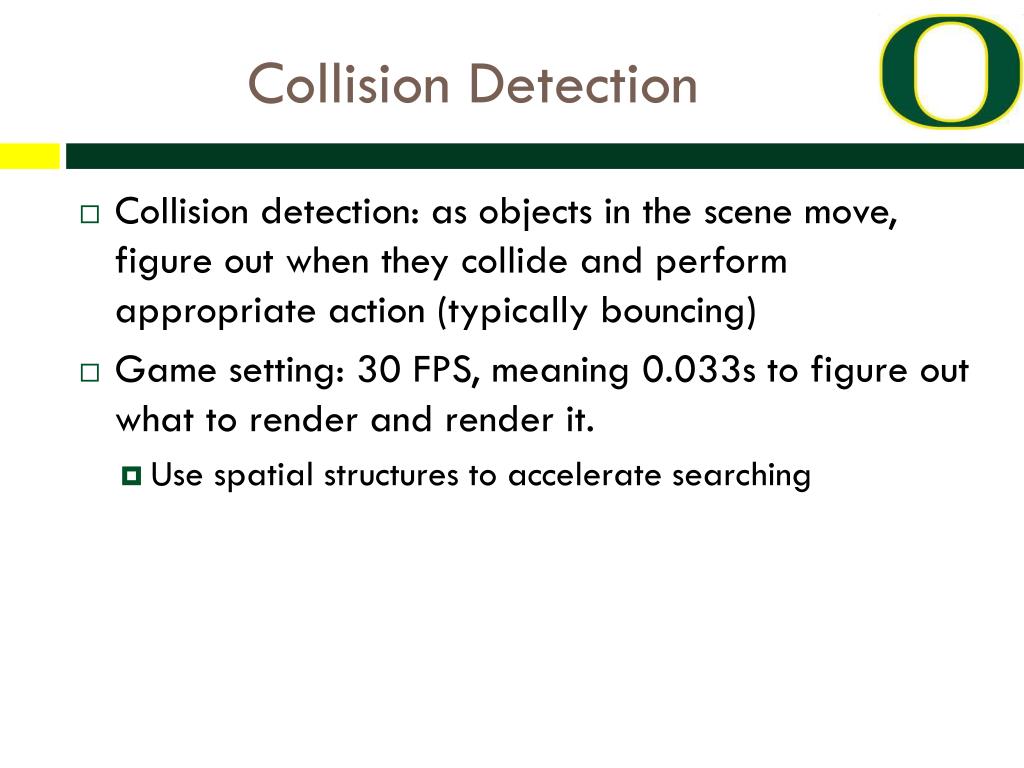 Collision Detection • Collision detection: as objects in the scene move, figure out when they collide and perform appropriate action (typically bouncing) • Game setting: 30 FPS, meaning 0.033s to figure out what to render and render it. • Use spatial structures to accelerate searching