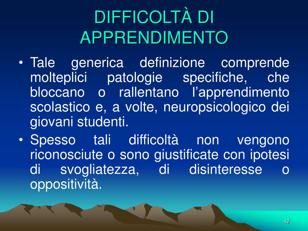 DIFFICOLTÀ DI APPRENDIMENTO • Tale generica definizione comprende molteplici patologie specifiche, che bloccano o rallentano l’apprendimento scolastico e, a volte, neuropsicologico dei giovani studenti. • Spesso tali difficoltà non vengono riconosciute o sono giustificate con ipotesi di svogliatezza, di disinteresse o oppositività.