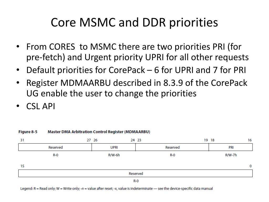 Core MSMC and DDR priorities • From CORES to MSMC there are two priorities PRI (for pre-fetch) and Urgent priority UPRI for all other requests • Default priorities for CorePack – 6 for UPRI and 7 for PRI • Register MDMAARBU described in 8.3.9 of the CorePack UG enable the user to change the priorities • CSL API