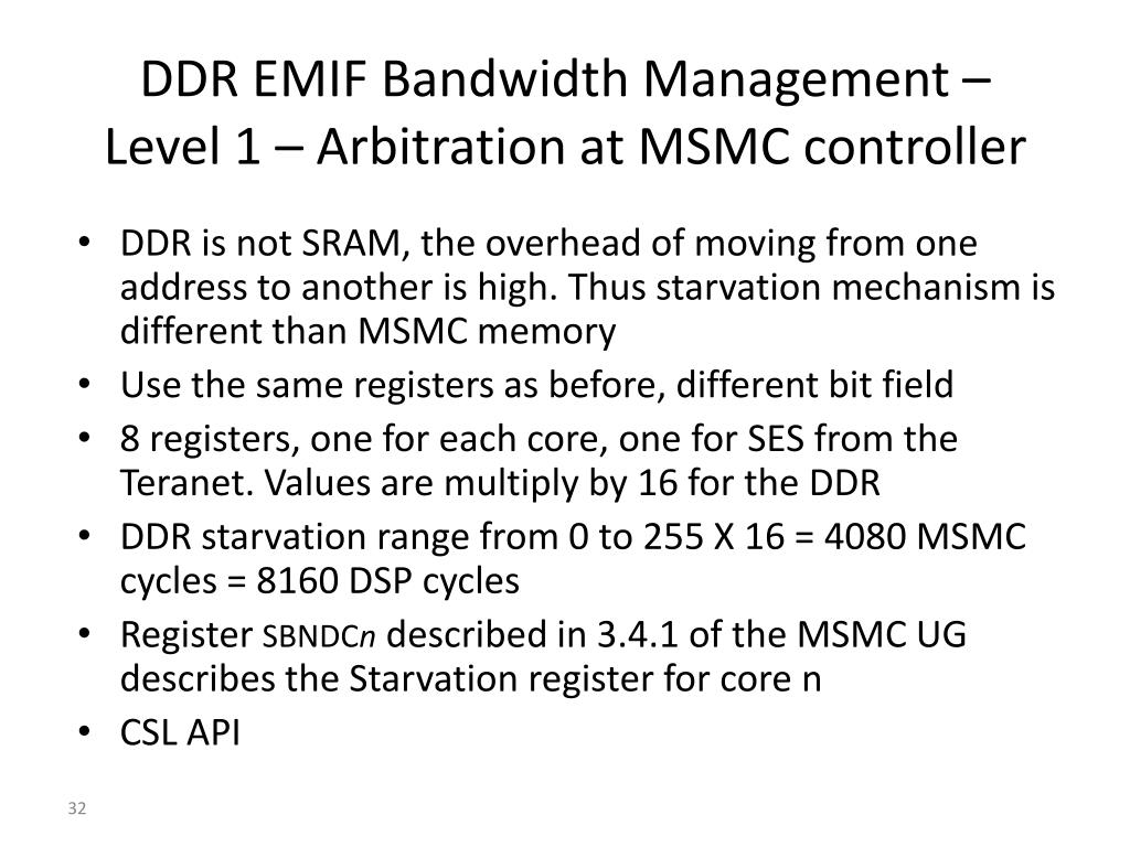 DDR EMIF Bandwidth Management – Level 1 – Arbitration at MSMC controller • DDR is not SRAM, the overhead of moving from one address to another is high. Thus starvation mechanism is different than MSMC memory • Use the same registers as before, different bit field • 8 registers, one for each core, one for SES from the Teranet. Values are multiply by 16 for the DDR • DDR starvation range from 0 to 255 X 16 = 4080 MSMC cycles = 8160 DSP cycles • Register SBNDCn described in 3.4.1 of the MSMC UG describes the Starvation register for core n • CSL API