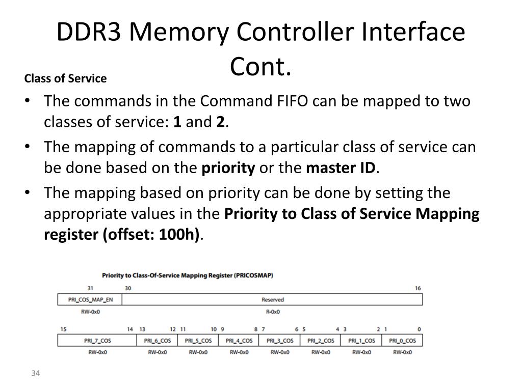 DDR3 Memory Controller Interface Cont. Class of Service • The commands in the Command FIFO can be mapped to two classes of service: 1 and 2. • The mapping of commands to a particular class of service can be done based on the priority or the master ID. • The mapping based on priority can be done by setting the appropriate values in the Priority to Class of Service Mapping register (offset: 100h).