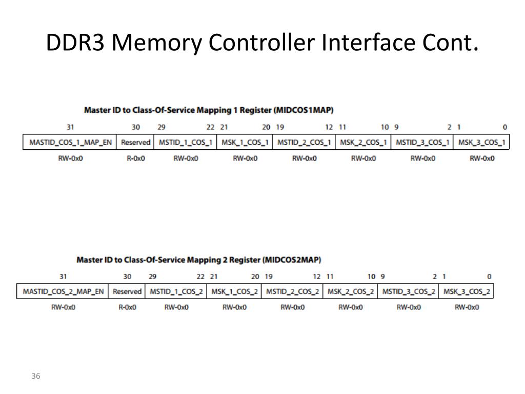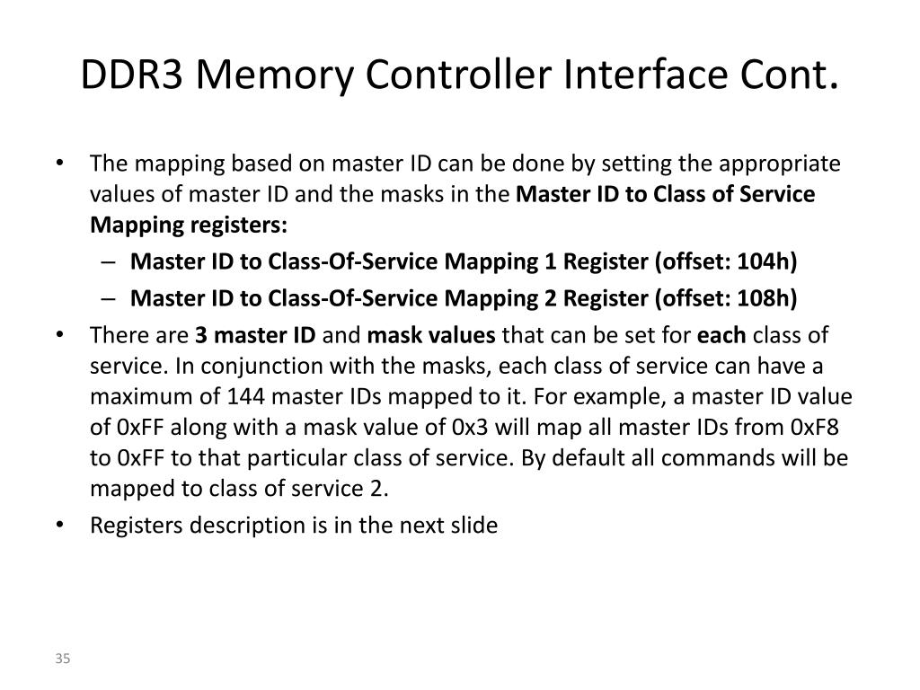 DDR3 Memory Controller Interface Cont. • The mapping based on master ID can be done by setting the appropriate values of master ID and the masks in the Master ID to Class of Service Mapping registers: • Master ID to Class-Of-Service Mapping 1 Register (offset: 104h) • Master ID to Class-Of-Service Mapping 2 Register (offset: 108h) • There are 3 master ID and mask values that can be set for each class of service. In conjunction with the masks, each class of service can have a maximum of 144 master IDs mapped to it. For example, a master ID value of 0xFF along with a mask value of 0x3 will map all master IDs from 0xF8 to 0xFF to that particular class of service. By default all commands will be mapped to class of service 2. • Registers description is in the next slide