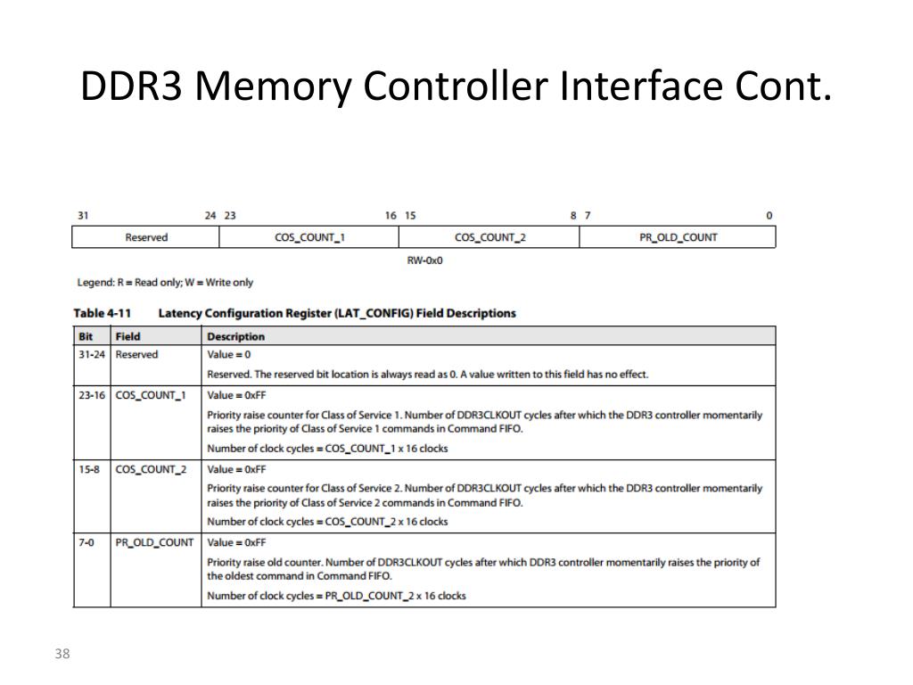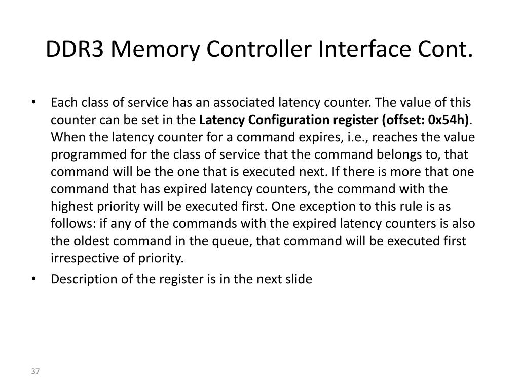 DDR3 Memory Controller Interface Cont. • Each class of service has an associated latency counter. The value of this counter can be set in the Latency Configuration register (offset: 0x54h). When the latency counter for a command expires, i.e., reaches the value programmed for the class of service that the command belongs to, that command will be the one that is executed next. If there is more that one command that has expired latency counters, the command with the highest priority will be executed first. One exception to this rule is as follows: if any of the commands with the expired latency counters is also the oldest command in the queue, that command will be executed first irrespective of priority. • Description of the register is in the next slide