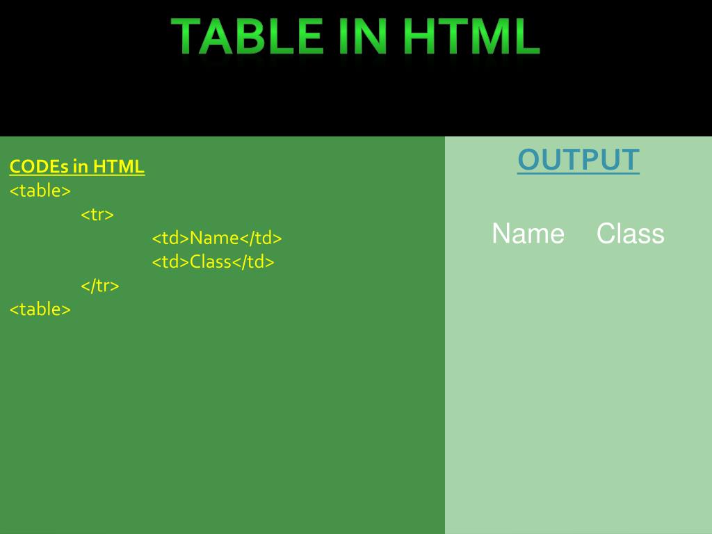 Table in HTML OUTPUT Name Class CODEs in HTML <table> <tr> <td>Name</td> <td>Class</td> </tr> <table>