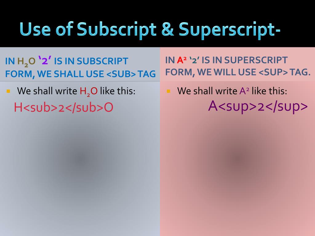 Use of Subscript & Superscript- In H2O‘2’ is in Subscript form, we shall use <Sub> Tag InA2 ‘2’ is in Superscript form, we will use <sup> tag. We shall write A2 like this: • We shall write H2O like this: A<sup>2</sup> H<sub>2</sub>O