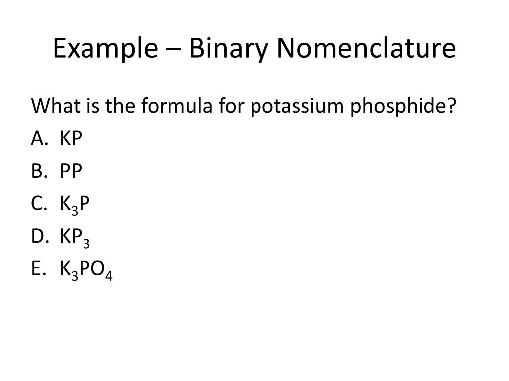 Example – Binary Nomenclature What is the formula for potassium phosphide? • KP • PP • K3P • KP3 • K3PO4