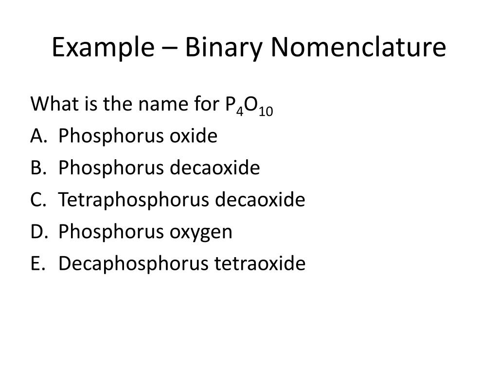Example – Binary Nomenclature What is the name for P4O10 • Phosphorus oxide • Phosphorus decaoxide • Tetraphosphorusdecaoxide • Phosphorus oxygen • Decaphosphorustetraoxide