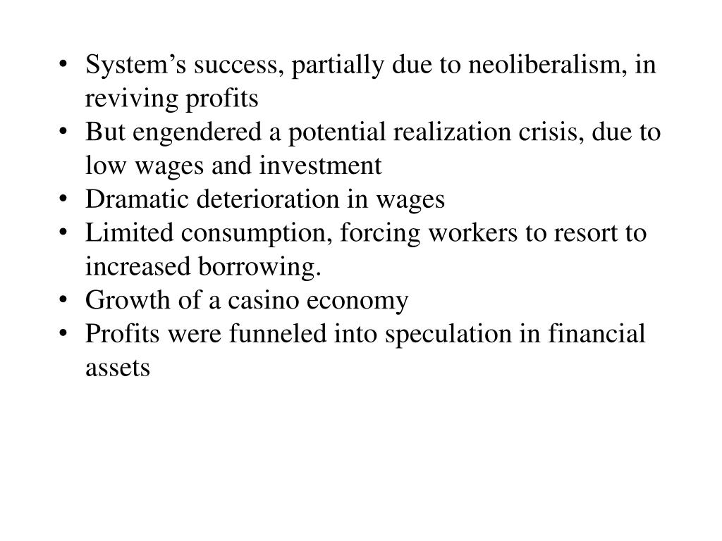 System’s success, partially due to neoliberalism, in reviving profits • But engendered a potential realization crisis, due to low wages and investment • Dramatic deterioration in wages • Limited consumption, forcing workers to resort to increased borrowing. • Growth of a casino economy • Profits were funneled into speculation in financial assets