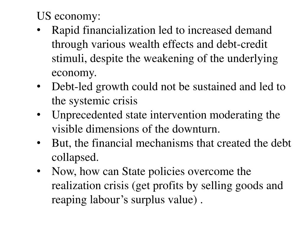 US economy: • Rapid financializationled to increased demand through various wealth effects and debt-credit stimuli, despite the weakening of the underlying economy. • Debt-led growth could not be sustained and led to the systemic crisis • Unprecedented state intervention moderating the visible dimensions of the downturn. • But, the financial mechanisms that created the debt collapsed. • Now, how can State policies overcome the realization crisis (get profits by selling goods and reaping labour’s surplus value) .