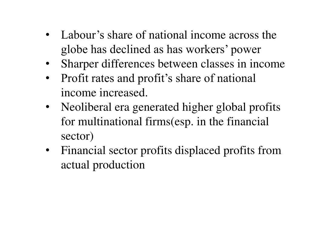 Labour’s share of national income across the globe has declined as has workers’ power • Sharper differences between classes in income • Profit rates and profit’s share of national income increased. • Neoliberal era generated higher global profits for multinational firms(esp. in the financial sector) • Financial sector profits displaced profits from actual production