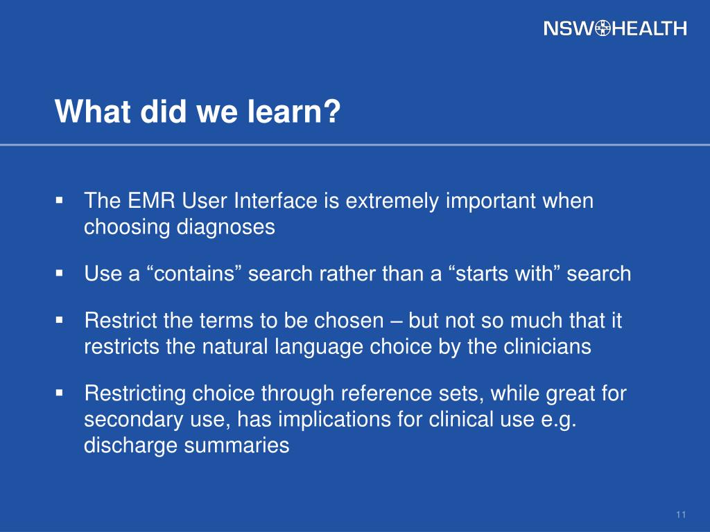 What did we learn? • The EMR User Interface is extremely important when choosing diagnoses • Use a “contains” search rather than a “starts with” search • Restrict the terms to be chosen – but not so much that it restricts the natural language choice by the clinicians • Restricting choice through reference sets, while great for secondary use, has implications for clinical use e.g. discharge summaries