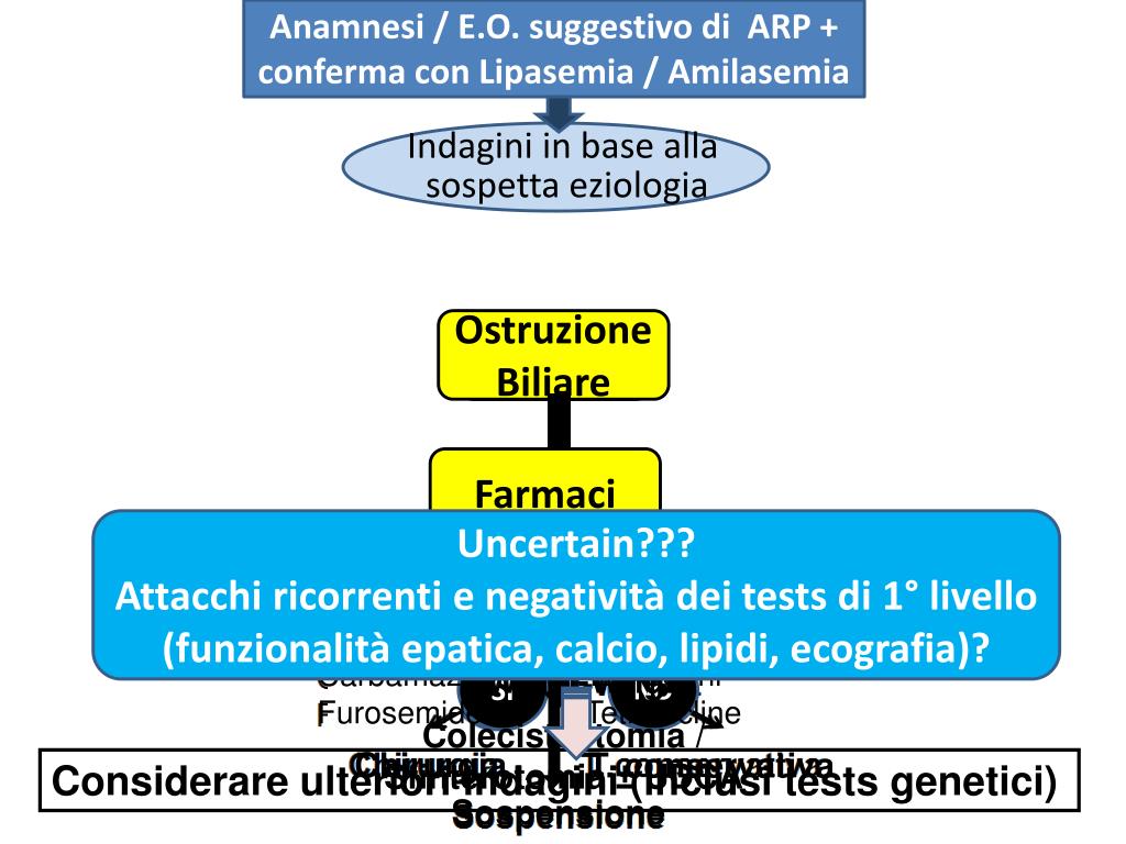 Anamnesi / E.O. suggestivo di ARP + conferma con Lipasemia / Amilasemia Indagini in base alla sospetta eziologia Ostruzione Biliare Trauma Infezioni Farmaci Sierologia/Colture US/TC US/TC Uncertain??? Attacchi ricorrenti e negatività dei tests di 1° livello (funzionalità epatica, calcio, lipidi, ecografia)? Azatioprina Cotrimoxazolo Mercaptopurina Paracetamolo Steroidi Valproato Carbamazepina Estrogeni Furosemide Tetracicline Danno anatomico dotto pancreatico TORCH Parotite Widal-Wright Calcoli biliari SI NO Colecistectomia / Sfinterotomia ± UDCA Chirurgia T. conservativa Considerare ulteriori indagini (inclusi tests genetici) Sospensione