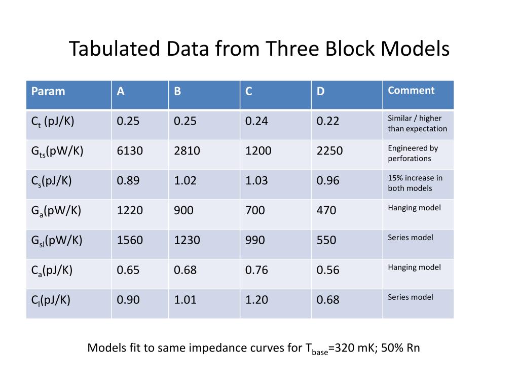 Tabulated Data from Three Block Models Models fit to same impedance curves for Tbase=320 mK; 50% Rn