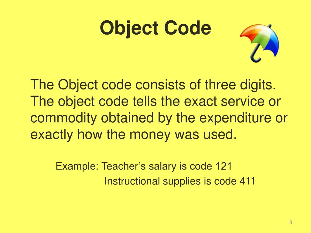 Object Code The Object code consists of three digits. The object code tells the exact service or commodity obtained by the expenditure or exactly how the money was used. Example: Teacher’s salary is code 121 Instructional supplies is code 411