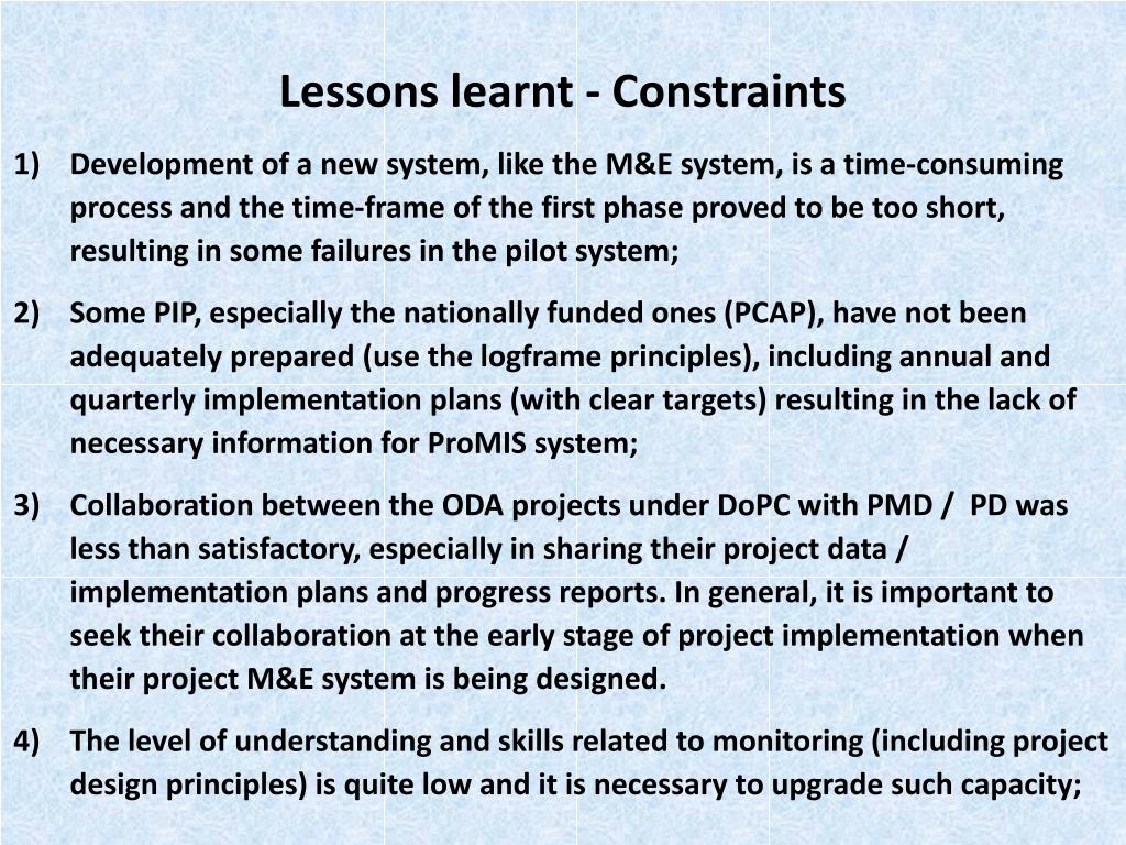 Lessons learnt - Constraints Development of a new system, like the M&E system, is a time-consuming process and the time-frame of the first phase proved to be too short, resulting in some failures in the pilot system; Some PIP, especially the nationally funded ones (PCAP), have not been adequately prepared (use the logframe principles), including annual and quarterly implementation plans (with clear targets) resulting in the lack of necessary information for ProMIS system; Collaboration between the ODA projects under DoPCwith PMD / PD was less than satisfactory, especially in sharing their project data / implementation plans and progress reports. In general, it is important to seek their collaboration at the early stage of project implementation when their project M&E system is being designed. The level of understanding and skills related to monitoring (including project design principles) is quite low and it is necessary to upgrade such capacity;