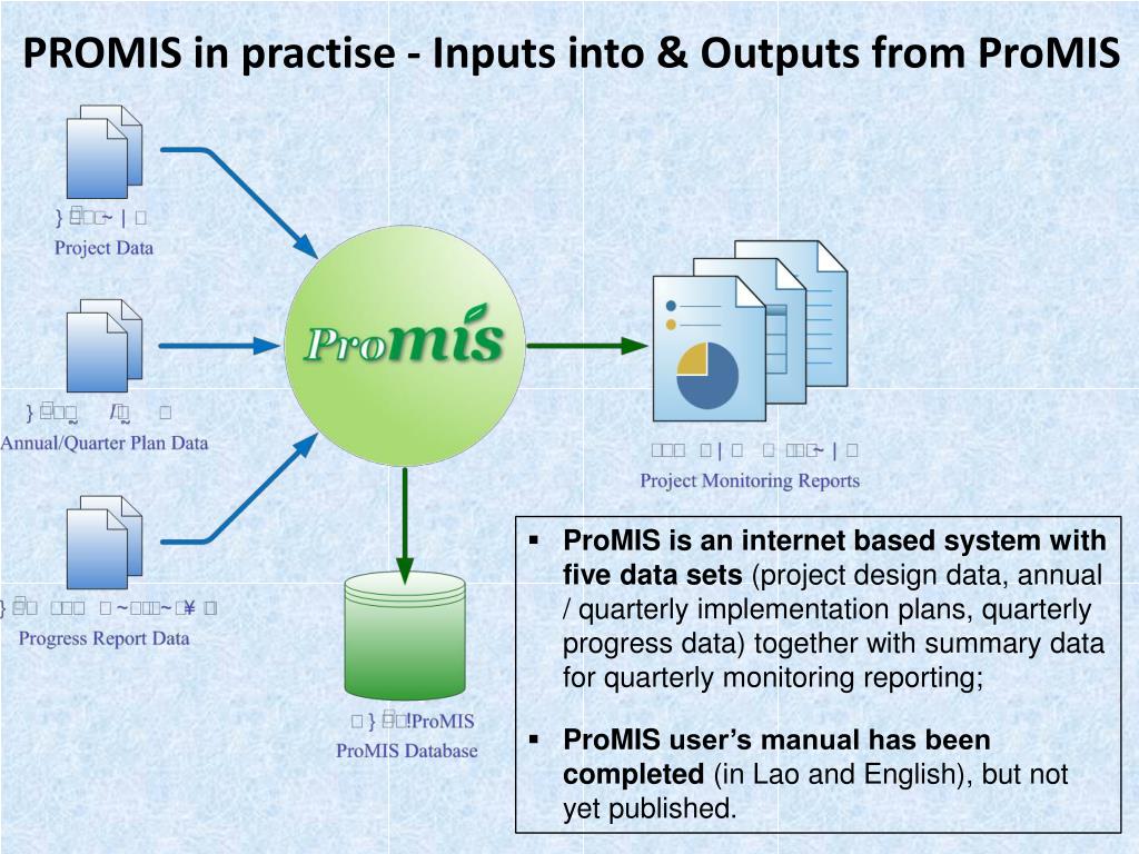 PROMIS in practise - Inputs into & Outputs from ProMIS • ProMIS is an internet based system with five data sets (project design data, annual / quarterly implementation plans, quarterly progress data) together with summary data for quarterly monitoring reporting; • ProMISuser’s manual has been completed (in Lao and English), but not yet published.