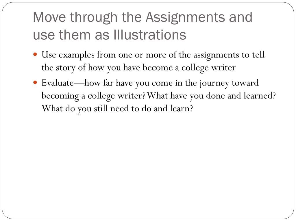 Move through the Assignments and use them as Illustrations • Use examples from one or more of the assignments to tell the story of how you have become a college writer • Evaluate—how far have you come in the journey toward becoming a college writer? What have you done and learned? What do you still need to do and learn?