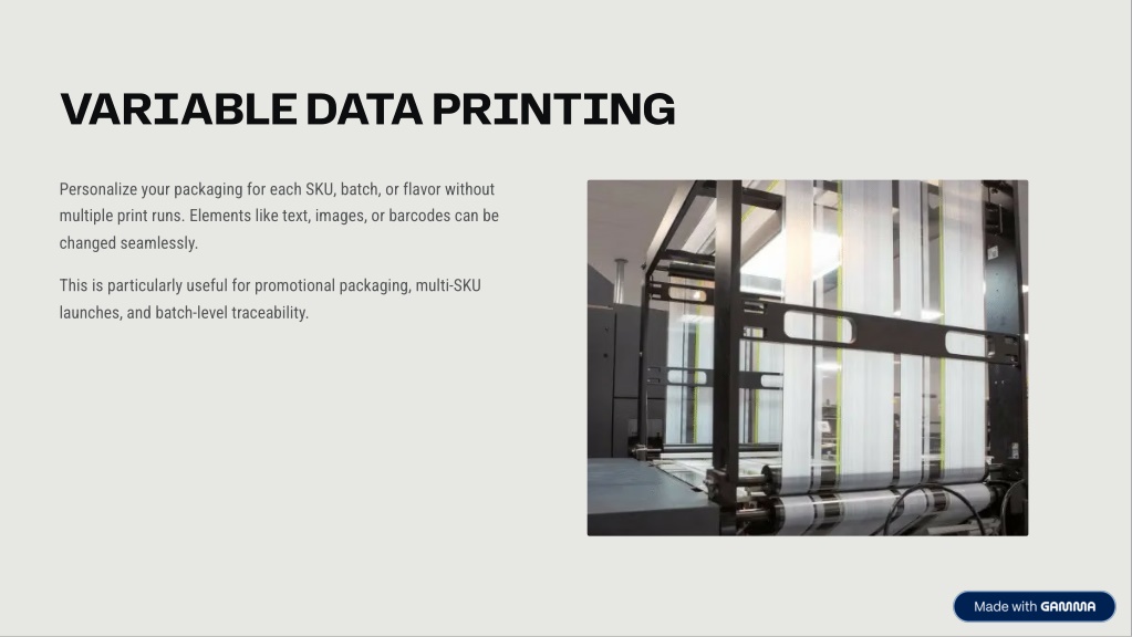 VARIABLE DATA PRINTING Personalize your packaging for each SKU, batch, or flavor without multiple print runs. Elements like text, images, or barcodes can be changed seamlessly. This is particularly useful for promotional packaging, multi-SKU launches, and batch-level traceability.