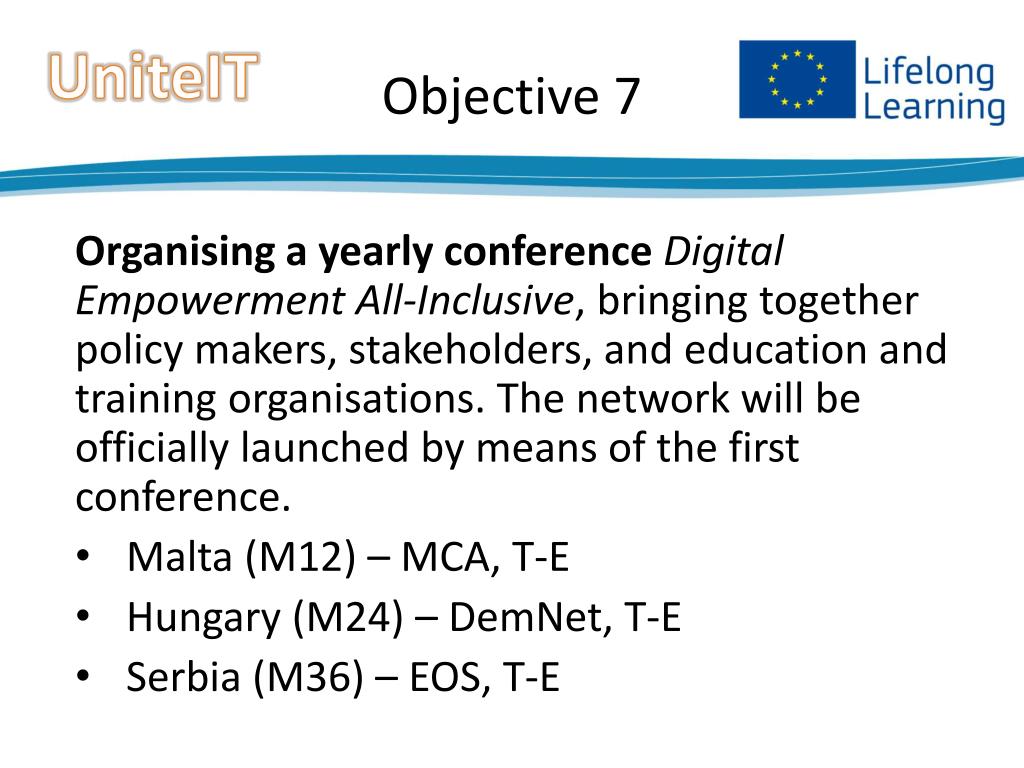 UniteIT Objective 7 Organisinga yearly conference Digital Empowerment All-Inclusive, bringing together policy makers, stakeholders, and education and training organisations. The network will be officially launched by means of the first conference. • Malta (M12) – MCA, T-E • Hungary (M24) – DemNet, T-E • Serbia (M36) – EOS, T-E