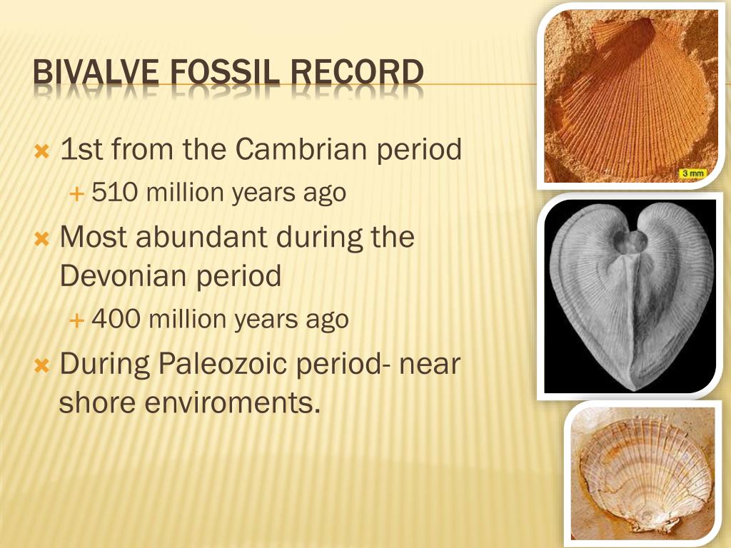 1st fromtheCambrianperiod • 510 millionyearsago • MostabundantduringtheDevonianperiod • 400 millionyearsago • DuringPaleozoicperiod- near shore enviroments. BivalveFossil record
