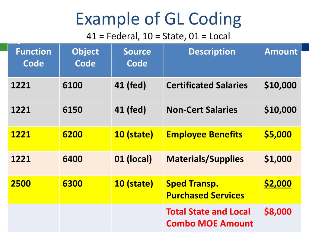 Funding Information - Example Amount to run Special Education Program in 2013-14: $500,000 IDEA Part B (611) Allocation in 2013-14: $150,000 MOE from State and Local Combination: $350,000