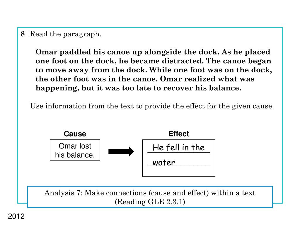 8 Read the paragraph. • Omar paddled his canoe up alongside the dock. As he placed one foot on the dock, he became distracted. The canoe began to move away from the dock. While one foot was on the dock, the other foot was in the canoe. Omar realized what was happening, but it was too late to recover his balance. • Use information from the text to provide the effect for the given cause. He fell in the water Analysis 7: Make connections (cause and effect) within a text (Reading GLE 2.3.1) 2012