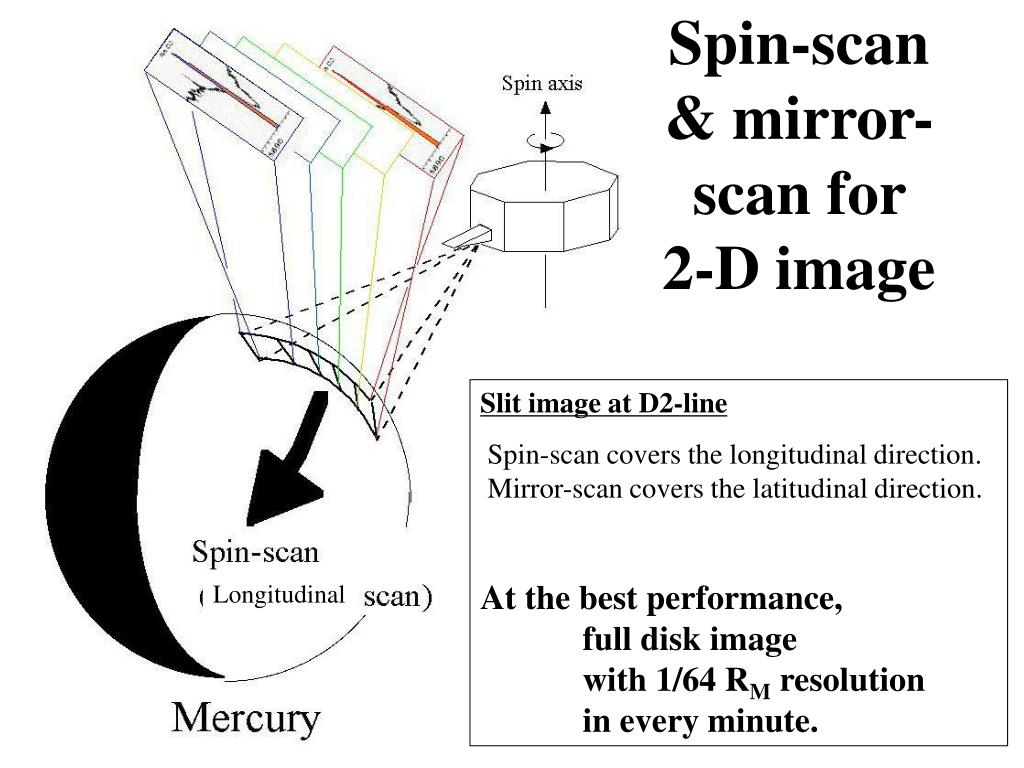 Main objectives of MSASI • 1. To image sodium exosphere (column density and spatial distribution) with a spatial resolution of 1/64 RM and intensity range from 10M to 10K Rayleigh. • These are sufficient to find sodium rich spots on the surface, • if they do exist. (e.g. radar bright spots and Caloris basin). • 2. To measure local and temporal variations of the sodium exosphere (time scale: less than a few hours) • - short-term: Substorm • - middle: North/South asymmetry • - long: Seasonal variation and • places of interest (Caloris basin, polar regions, etc.) • 3. To identify release mechanisms which are stimulated by incoming materials such as solar wind ions and micro-meteoroids. Close collaboration with MPO/Phebus [Abundance for minor elements, High-resolution vertical distributions, etc.]