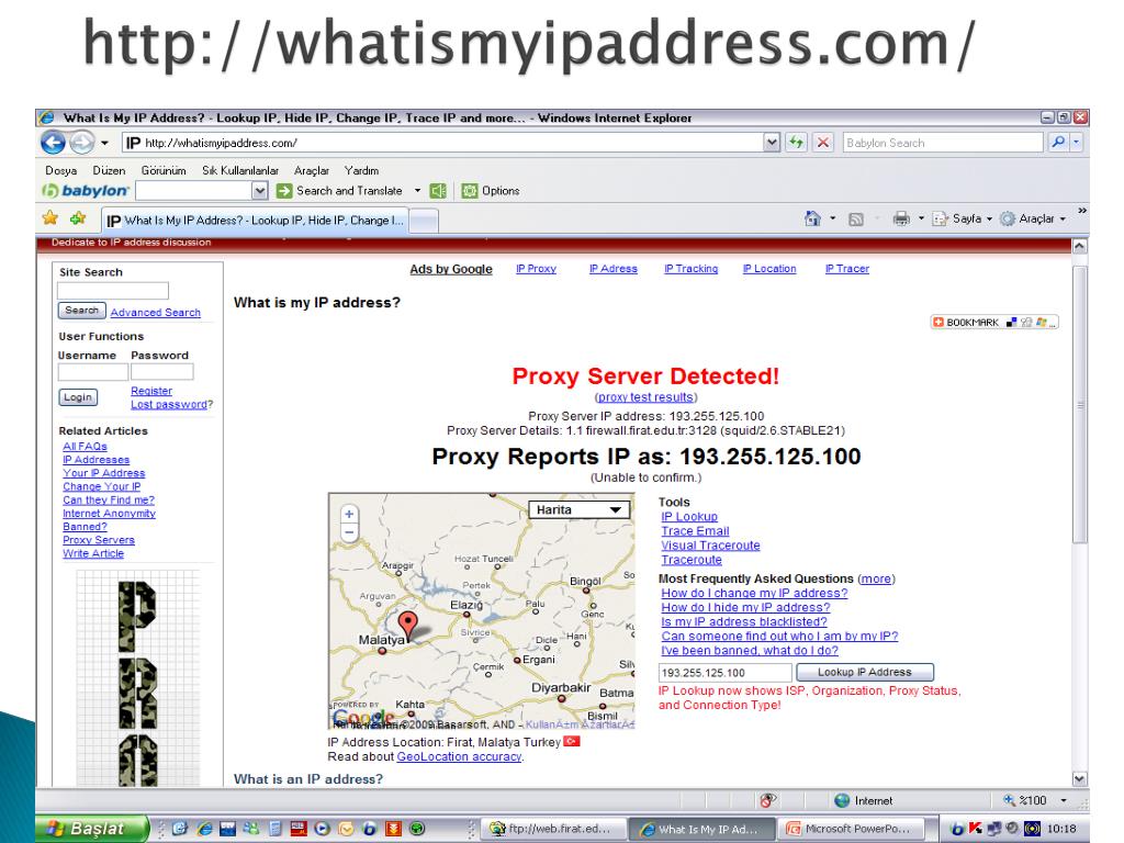 IP Adresi Internet'te her bilgisayarın bir IP (Internet Protokol) adresi vardır. Tipik bir IP adresi, noktalarla ayrılan dört rakamdan oluşur; örneğin, 212.156.4.20. Bir bilgisayarın IP adresi varsa, Internet üzerindeki tüm bilgisayarlar bu adresi kolayca bulur. Yani bir sitenin IP adresini biliyorsanız, Web tarayıcınıza bu adresi yazarak da bağlanabilirsiniz.