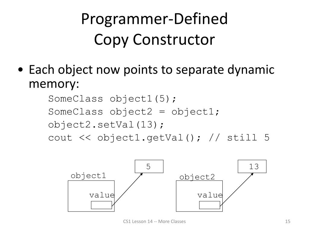Programmer-Defined Copy Constructor • Each object now points to separate dynamic memory: SomeClass object1(5); SomeClass object2 = object1; object2.setVal(13); cout << object1.getVal(); // still 5 5 13 object1 object2 value value CS1 Lesson 14 -- More Classes