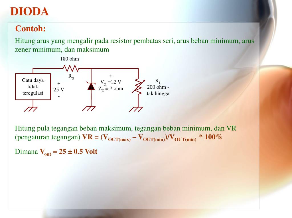 DIODA Contoh: Hitung arus yang mengalir pada resistor pembatas seri, arus beban minimum, arus zener minimum, dan maksimum Hitung pula tegangan beban maksimum, tegangan beban minimum, dan VR (pengaturan tegangan) VR = (VOUT(max) – VOUT(min))/VOUT(min) * 100% Dimana Vout = 25 ± 0.5 Volt