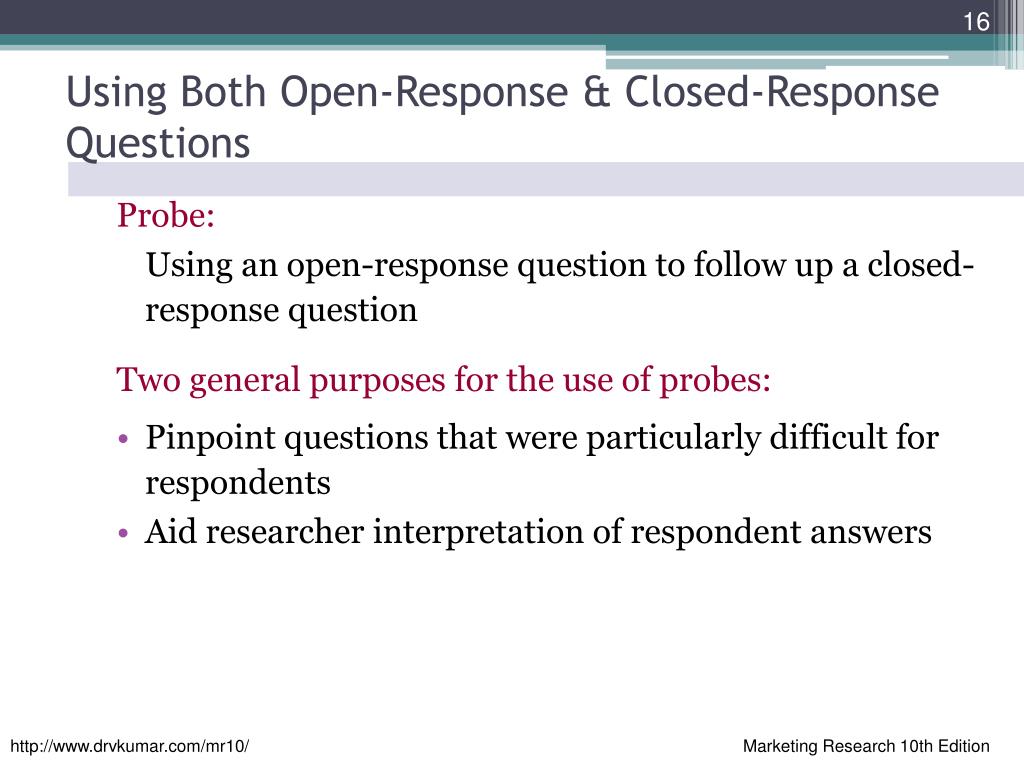 Using Both Open-Response & Closed-Response Questions Probe: Using an open-response question to follow up a closed-response question Two general purposes for the use of probes: • Pinpoint questions that were particularly difficult for respondents • Aid researcher interpretation of respondent answers