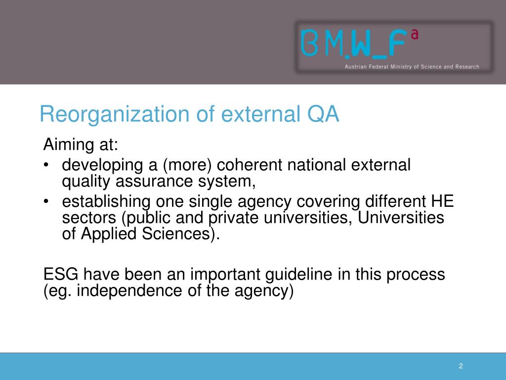 Reorganization of external QA • Aimingat: • developing a (more) coherent national externalqualityassurancesystem, • establishingonesingleagencycovering different HE sectors (publicand private universities, Universitiesof Applied Sciences). • ESG havebeen an importantguideline in thisprocess (eg. independenceoftheagency)