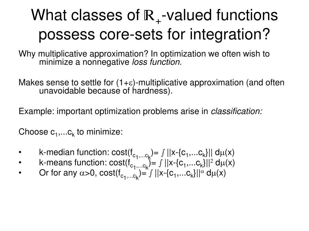 What classes of +-valued functions possess core-sets for integration? Why multiplicative approximation? In optimization we often wish to minimize a nonnegative loss function. Makes sense to settle for (1+)-multiplicative approximation (and often unavoidable because of hardness). Example: important optimization problems arise in classification: Choose c1,...ck to minimize: k-median function: cost(fc1,...ck)= s ||x-{c1,...ck}|| d(x) k-means function: cost(fc1,...ck)= s ||x-{c1,...ck}||2 d(x) Or for any >0, cost(fc1,...ck)= s ||x-{c1,...ck}|| d(x)