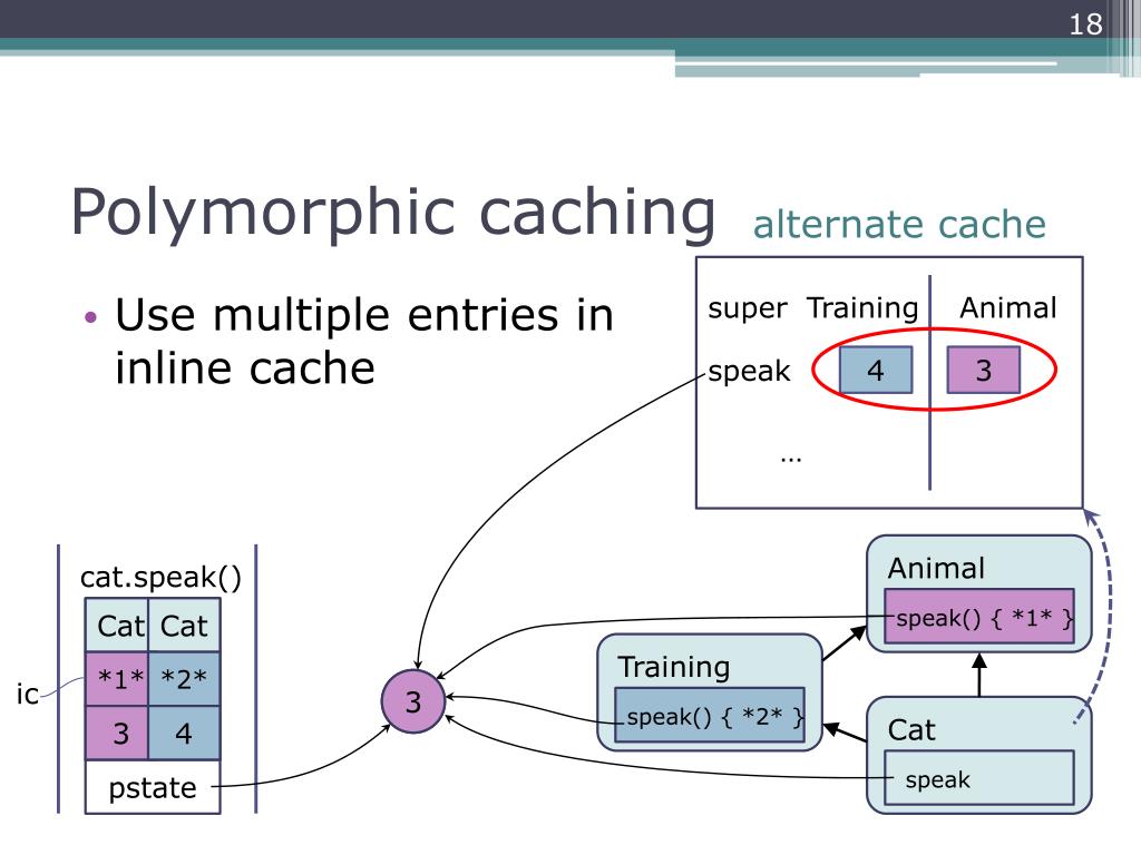 Polymorphic caching alternate cache • Use multiple entries in inline cache super Training Animal speak 4 3 … Training speak() { *2* } Animal cat.speak() class Cat Cat speak() { *1* } method *1* *2* ic 3 4 state 3 4 Cat pstate speak