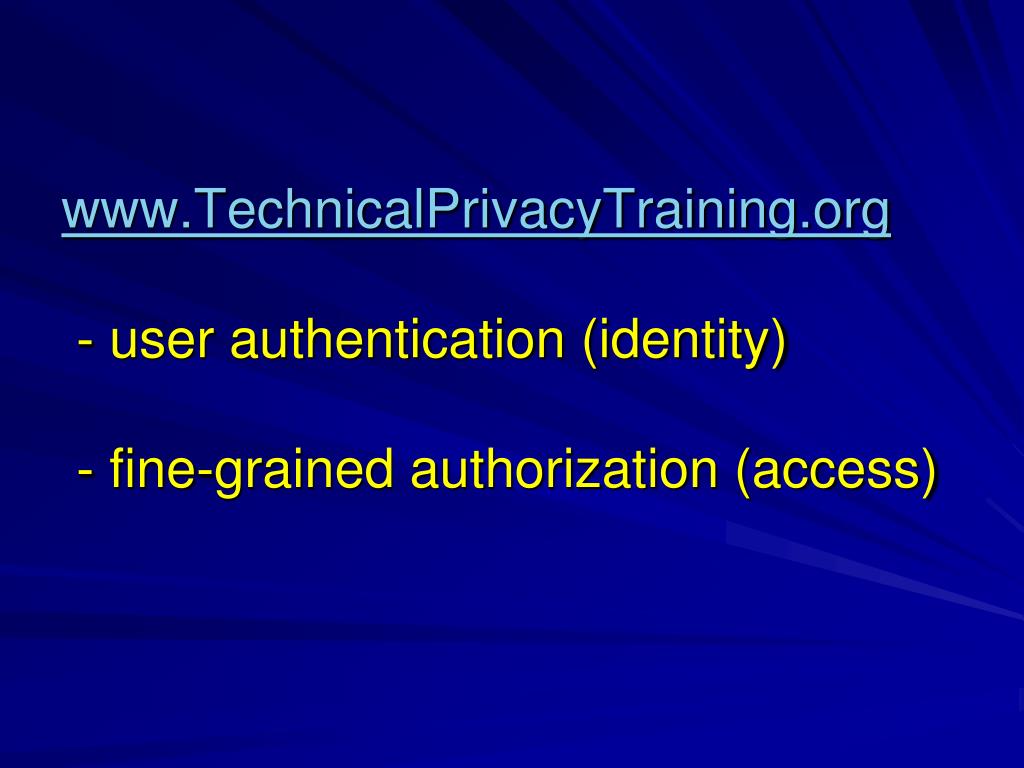 www.TechnicalPrivacyTraining.org - user authentication (identity) - fine-grained authorization (access)
