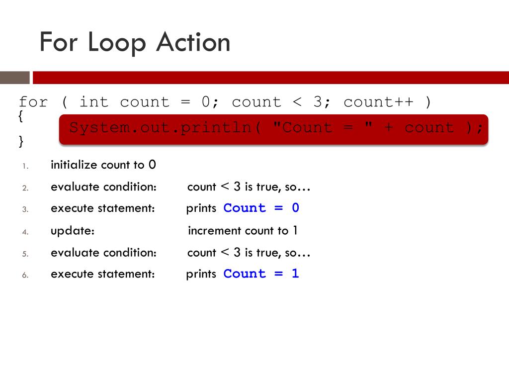 For Loop Action for ( int count = 0; count < 3; count++ ) System.out.println( "Count = " + count ); { } • initialize count to 0 • evaluate condition: count < 3 is true, so… • execute statement: prints Count = 0 • update: increment count to 1 • evaluate condition: count < 3 is true, so… • execute statement: prints Count = 1 • update: increment count to 2