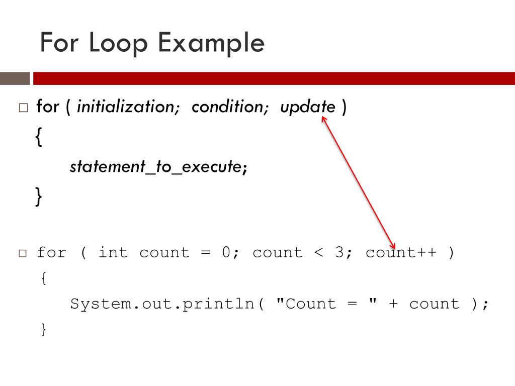 For Loop Example • for ( initialization; condition; update ) { statement_to_execute; } • for ( int count = 0; count < 3; count++ ) { System.out.println( "Count = " + count ); }