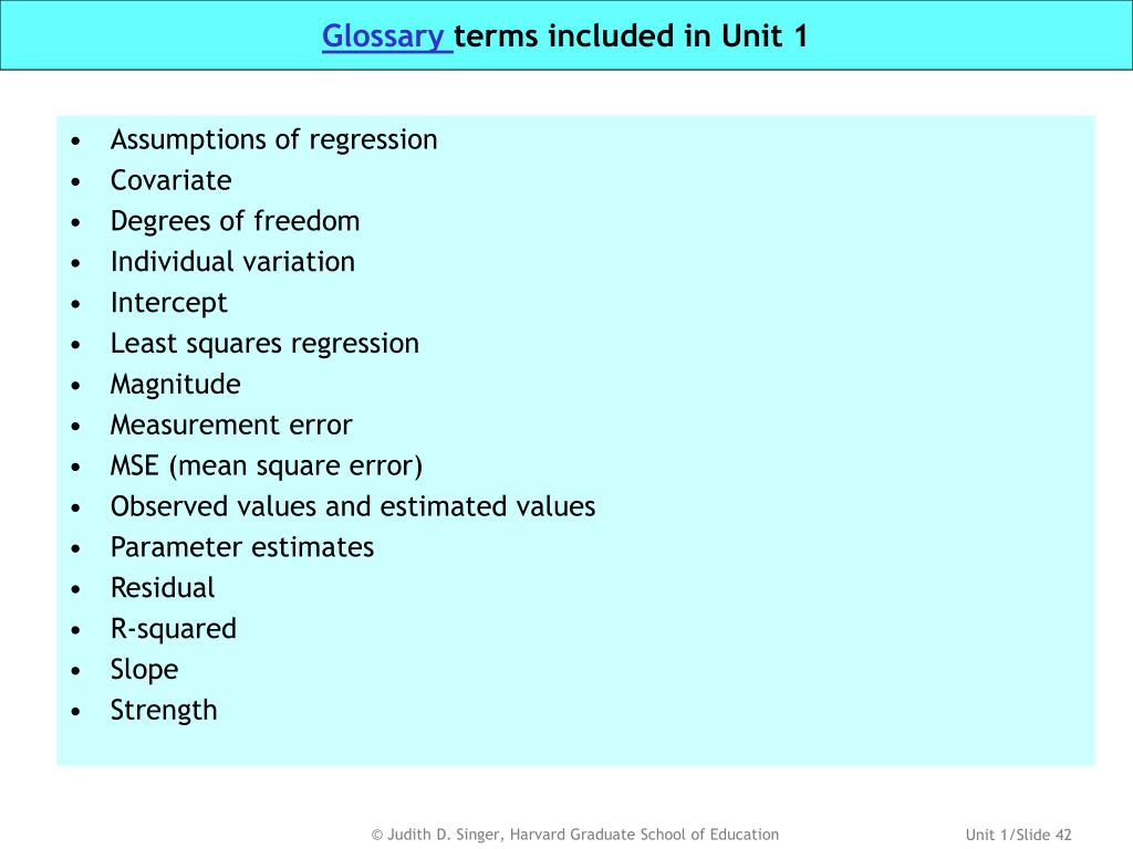 Glossary terms included in Unit 1 • Assumptions of regression • Covariate • Degrees of freedom • Individual variation • Intercept • Least squares regression • Magnitude • Measurement error • MSE (mean square error) • Observed values and estimated values • Parameter estimates • Residual • R-squared • Slope • Strength