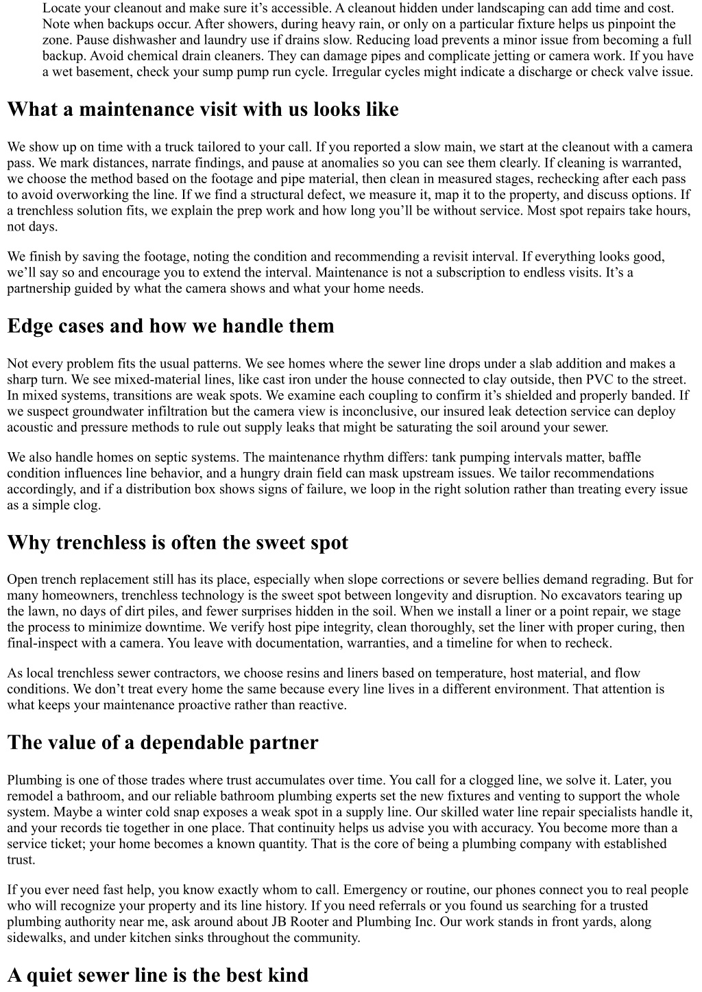 Locate your cleanout and make sure it’s accessible. A cleanout hidden under landscaping can add time and cost. Note when backups occur. After showers, during heavy rain, or only on a particular fixture helps us pinpoint the zone. Pause dishwasher and laundry use if drains slow. Reducing load prevents a minor issue from becoming a full backup. Avoid chemical drain cleaners. They can damage pipes and complicate jetting or camera work. If you have a wet basement, check your sump pump run cycle. Irregular cycles might indicate a discharge or check valve issue. What a maintenance visit with us looks like We show up on time with a truck tailored to your call. If you reported a slow main, we start at the cleanout with a camera pass. We mark distances, narrate findings, and pause at anomalies so you can see them clearly. If cleaning is warranted, we choose the method based on the footage and pipe material, then clean in measured stages, rechecking after each pass to avoid overworking the line. If we find a structural defect, we measure it, map it to the property, and discuss options. If a trenchless solution fits, we explain the prep work and how long you’ll be without service. Most spot repairs take hours, not days. We finish by saving the footage, noting the condition and recommending a revisit interval. If everything looks good, we’ll say so and encourage you to extend the interval. Maintenance is not a subscription to endless visits. It’s a partnership guided by what the camera shows and what your home needs. Edge cases and how we handle them Not every problem fits the usual patterns. We see homes where the sewer line drops under a slab addition and makes a sharp turn. We see mixed-material lines, like cast iron under the house connected to clay outside, then PVC to the street. In mixed systems, transitions are weak spots. We examine each coupling to confirm it’s shielded and properly banded. If we suspect groundwater infiltration but the camera view is inconclusive, our insured leak detection service can deploy acoustic and pressure methods to rule out supply leaks that might be saturating the soil around your sewer. We also handle homes on septic systems. The maintenance rhythm differs: tank pumping intervals matter, baffle condition influences line behavior, and a hungry drain field can mask upstream issues. We tailor recommendations accordingly, and if a distribution box shows signs of failure, we loop in the right solution rather than treating every issue as a simple clog. Why trenchless is often the sweet spot Open trench replacement still has its place, especially when slope corrections or severe bellies demand regrading. But for many homeowners, trenchless technology is the sweet spot between longevity and disruption. No excavators tearing up the lawn, no days of dirt piles, and fewer surprises hidden in the soil. When we install a liner or a point repair, we stage the process to minimize downtime. We verify host pipe integrity, clean thoroughly, set the liner with proper curing, then final-inspect with a camera. You leave with documentation, warranties, and a timeline for when to recheck. As local trenchless sewer contractors, we choose resins and liners based on temperature, host material, and flow conditions. We don’t treat every home the same because every line lives in a different environment. That attention is what keeps your maintenance proactive rather than reactive. The value of a dependable partner Plumbing is one of those trades where trust accumulates over time. You call for a clogged line, we solve it. Later, you remodel a bathroom, and our reliable bathroom plumbing experts set the new fixtures and venting to support the whole system. Maybe a winter cold snap exposes a weak spot in a supply line. Our skilled water line repair specialists handle it, and your records tie together in one place. That continuity helps us advise you with accuracy. You become more than a service ticket; your home becomes a known quantity. That is the core of being a plumbing company with established trust. If you ever need fast help, you know exactly whom to call. Emergency or routine, our phones connect you to real people who will recognize your property and its line history. If you need referrals or you found us searching for a trusted plumbing authority near me, ask around about JB Rooter and Plumbing Inc. Our work stands in front yards, along sidewalks, and under kitchen sinks throughout the community. A quiet sewer line is the best kind