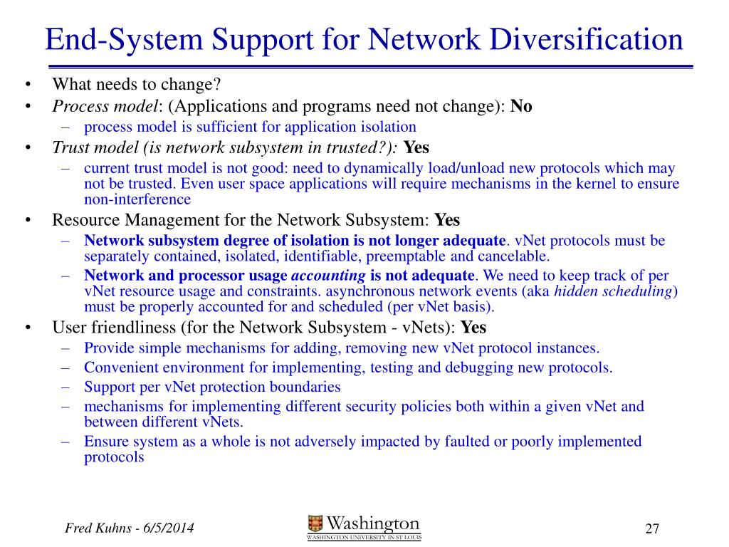 End-System Support for Network Diversification • What needs to change? • Process model: (Applications and programs need not change): No • process model is sufficient for application isolation • Trust model (is network subsystem in trusted?):Yes • current trust model is not good: need to dynamically load/unload new protocols which may not be trusted. Even user space applications will require mechanisms in the kernel to ensure non-interference • Resource Management for the Network Subsystem: Yes • Network subsystem degree of isolation is not longer adequate. vNet protocols must be separately contained, isolated, identifiable, preemptable and cancelable. • Network and processor usage accounting is not adequate. We need to keep track of per vNet resource usage and constraints. asynchronous network events (aka hidden scheduling) must be properly accounted for and scheduled (per vNet basis). • User friendliness (for the Network Subsystem - vNets): Yes • Provide simple mechanisms for adding, removing new vNet protocol instances. • Convenient environment for implementing, testing and debugging new protocols. • Support per vNet protection boundaries • mechanisms for implementing different security policies both within a given vNet and between different vNets. • Ensure system as a whole is not adversely impacted by faulted or poorly implemented protocols
