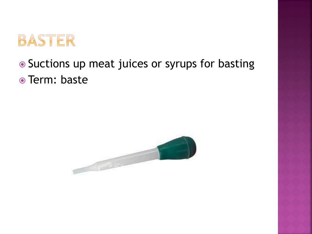 Baster • Suctions up meat juices or syrups for basting • Term: baste