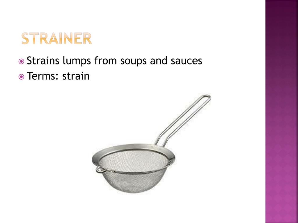 Strainer • Strains lumps from soups and sauces • Terms: strain