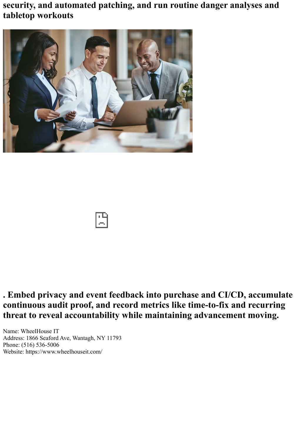 security, and automated patching, and run routine danger analyses and tabletop workouts . Embed privacy and event feedback into purchase and CI/CD, accumulate continuous audit proof, and record metrics like time‑to‑fix and recurring threat to reveal accountability while maintaining advancement moving. Name: WheelHouse IT Address: 1866 Seaford Ave, Wantagh, NY 11793 Phone: (516) 536-5006 Website: https://www.wheelhouseit.com/