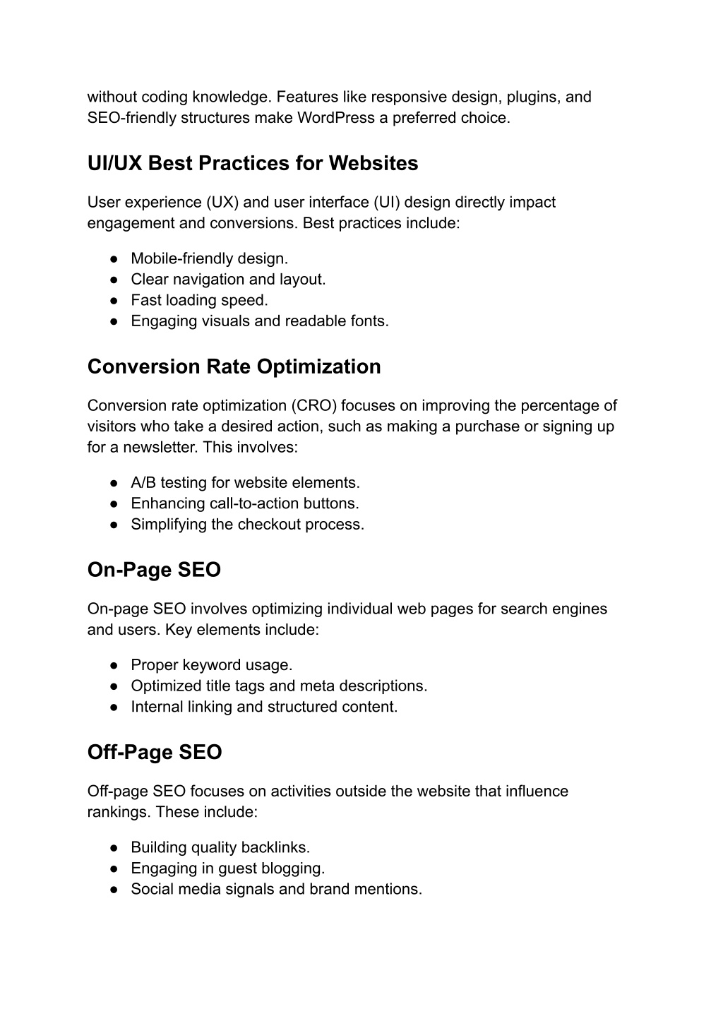 without coding knowledge. Features like responsive design, plugins, and SEO-friendly structures make WordPress a preferred choice. UI/UX Best Practices for Websites User experience (UX) and user interface (UI) design directly impact engagement and conversions. Best practices include: ● Mobile-friendly design. ● Clear navigation and layout. ● Fast loading speed. ● Engaging visuals and readable fonts. Conversion Rate Optimization Conversion rate optimization (CRO) focuses on improving the percentage of visitors who take a desired action, such as making a purchase or signing up for a newsletter. This involves: ● A/B testing for website elements. ● Enhancing call-to-action buttons. ● Simplifying the checkout process. On-Page SEO On-page SEO involves optimizing individual web pages for search engines and users. Key elements include: ● Proper keyword usage. ● Optimized title tags and meta descriptions. ● Internal linking and structured content. Off-Page SEO Off-page SEO focuses on activities outside the website that influence rankings. These include: ● Building quality backlinks. ● Engaging in guest blogging. ● Social media signals and brand mentions.
