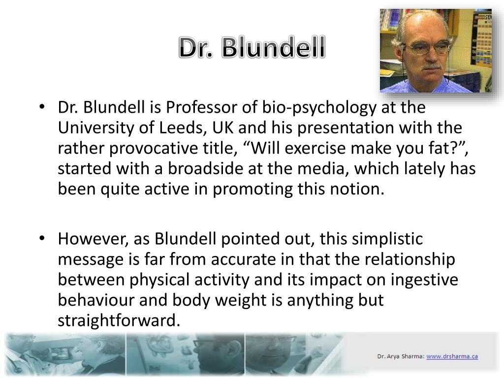 Dr. Blundell • Dr. Blundell is Professor of bio-psychology at the University of Leeds, UK and his presentation with the rather provocative title, “Will exercise make you fat?”, started with a broadside at the media, which lately has been quite active in promoting this notion. • However, as Blundell pointed out, this simplistic message is far from accurate in that the relationship between physical activity and its impact on ingestivebehaviour and body weight is anything but straightforward.