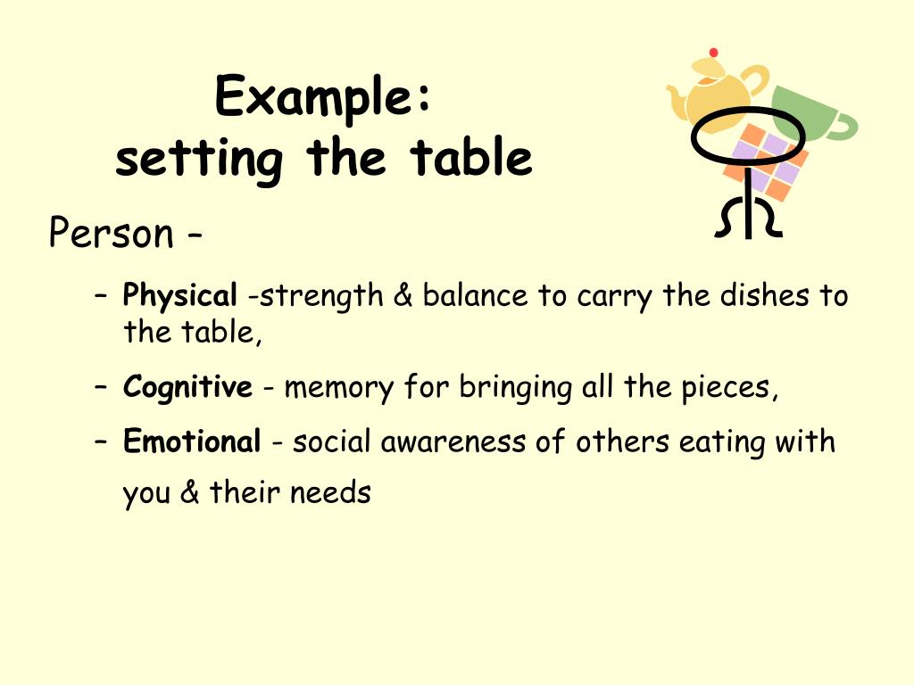 Example: setting the table Person– • Physical -strength & balance to carry the dishes to the table, • Cognitive - memory for bringing all the pieces, • Emotional - social awareness of others eating with you & their needs