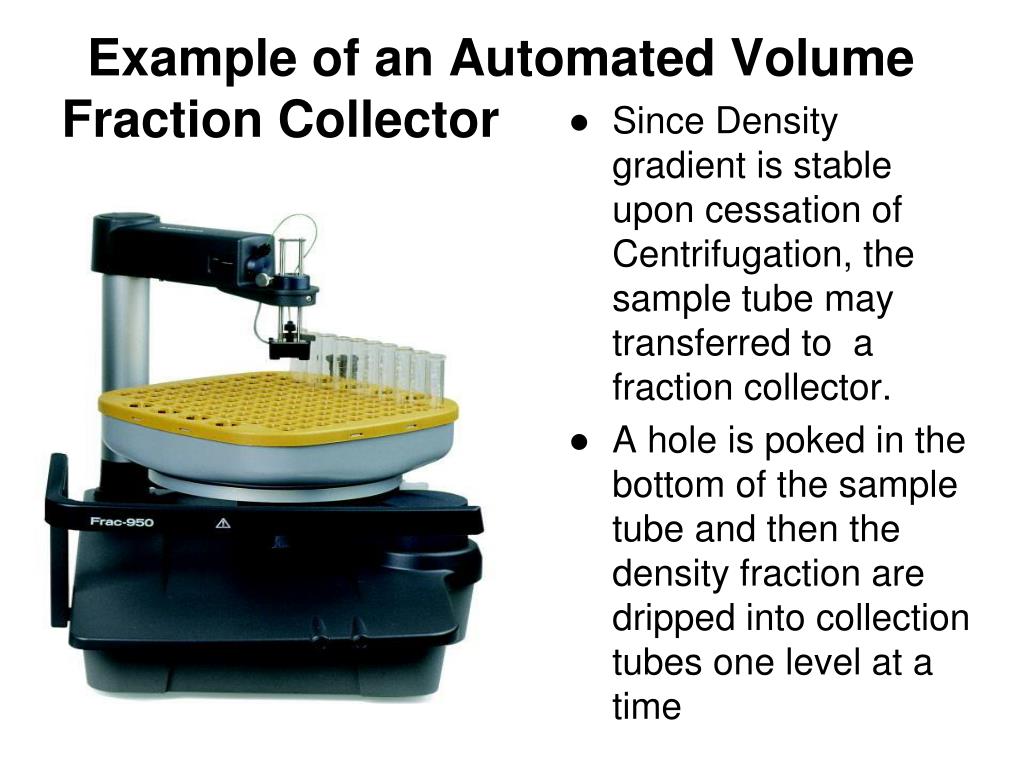 Example of an Automated Volume Fraction Collector • Since Density gradient is stable upon cessation of Centrifugation, the sample tube may transferred to a fraction collector. • A hole is poked in the bottom of the sample tube and then the density fraction are dripped into collection tubes one level at a time
