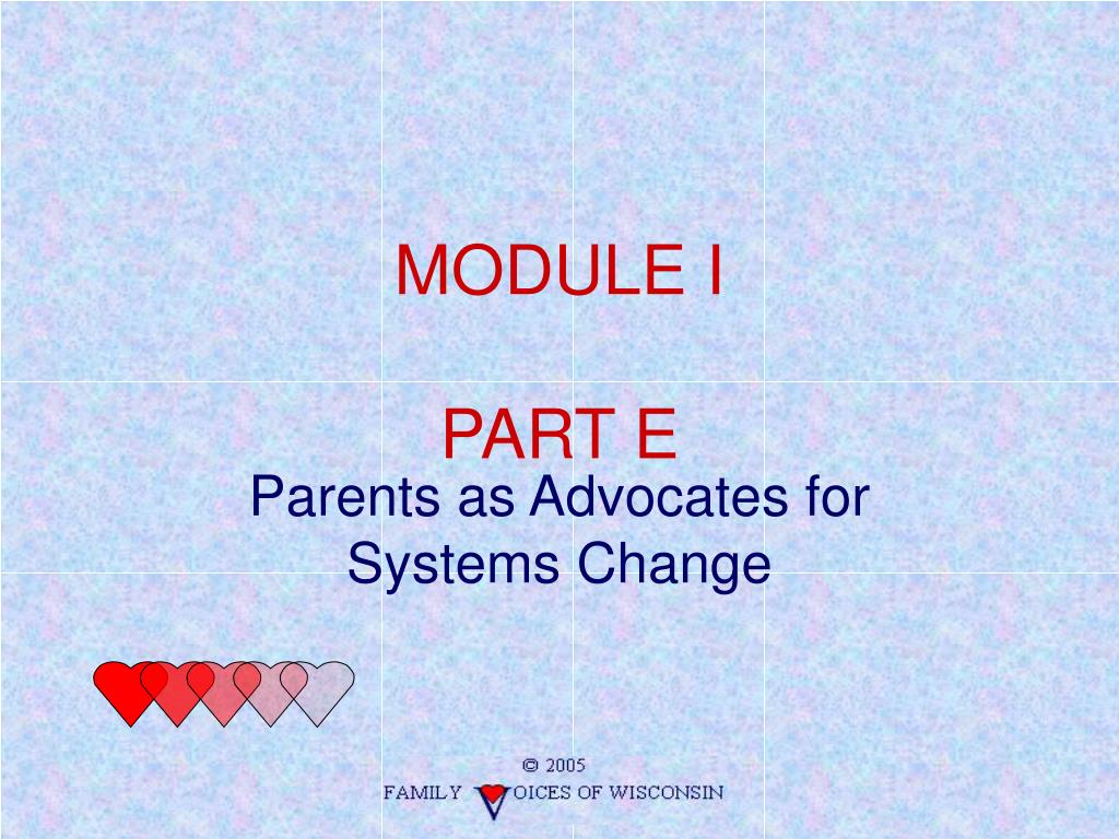 Part E: HandoutsParents as Advocates for Systems Change • Family Voices Parent Advocacy • Family Support Advisory Committee • Benefits of Families as Advisors • Advisory Roles Parents Can Play • Guiding Philosophy • What is Children’s Redesign? • State Level Councils, Boards, Committees or Organizations