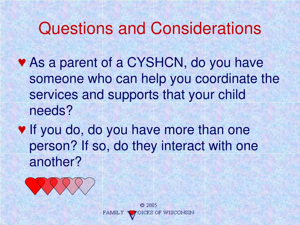 Questions and Considerations • As a parent of a CYSHCN, do you have someone who can help you coordinate the services and supports that your child needs? • If you do, do you have more than one person? If so, do they interact with one another?