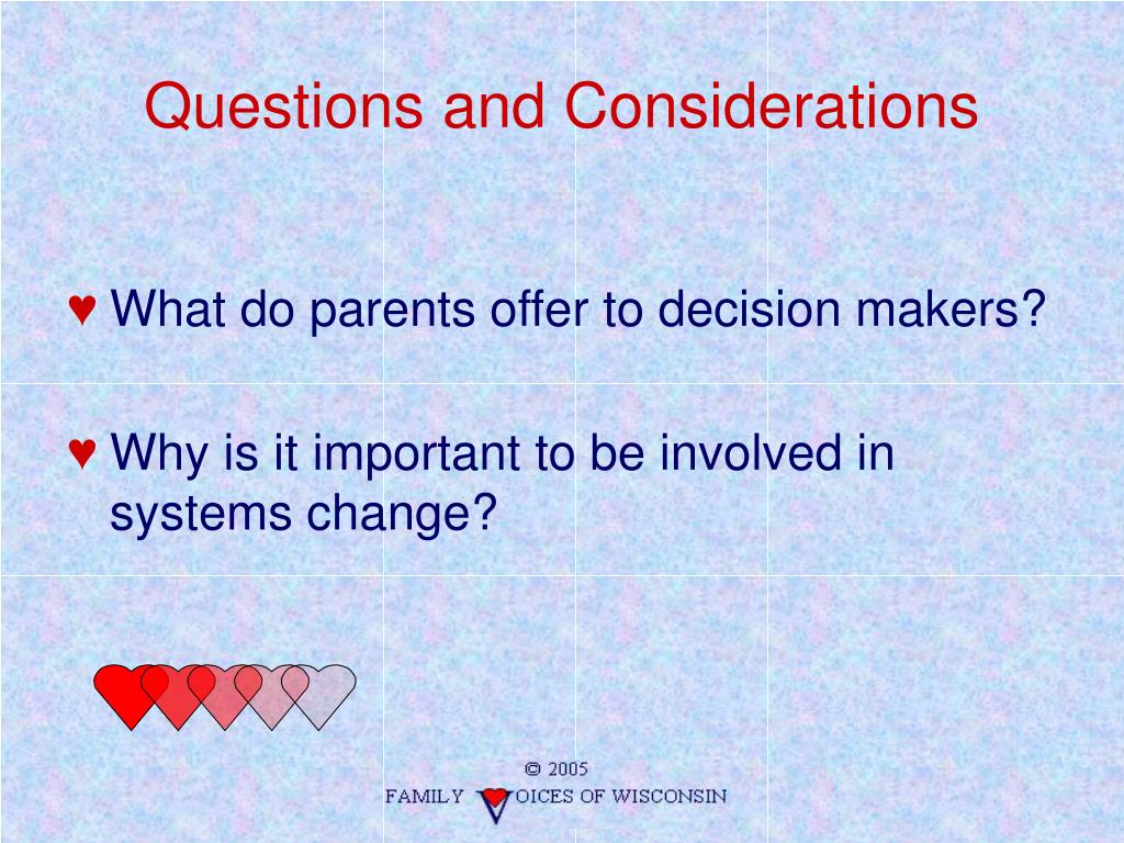 Questions and Considerations • What do parents offer to decision makers? • Why is it important to be involved in systems change?